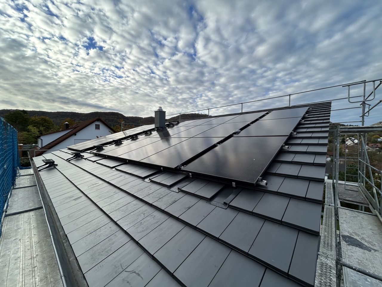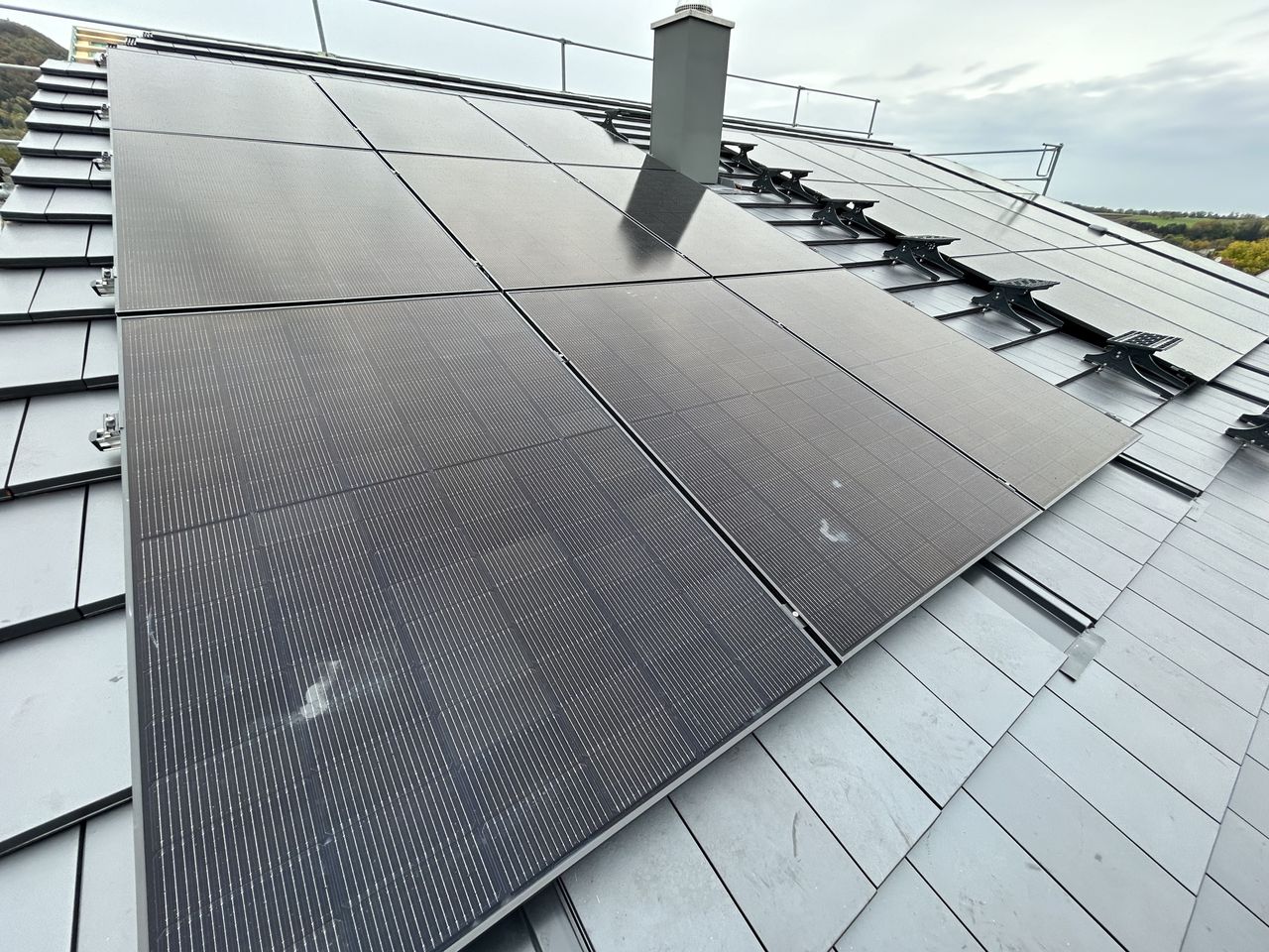 Der Kunde hat ein neues Dach erhalten und dieses mit anthrazitgrauen Ziegeln ausführen lassen. Hierzu sollte die PV-Anlage optisch passend ausgeführt werden.