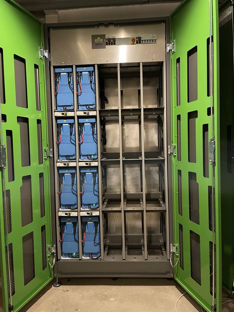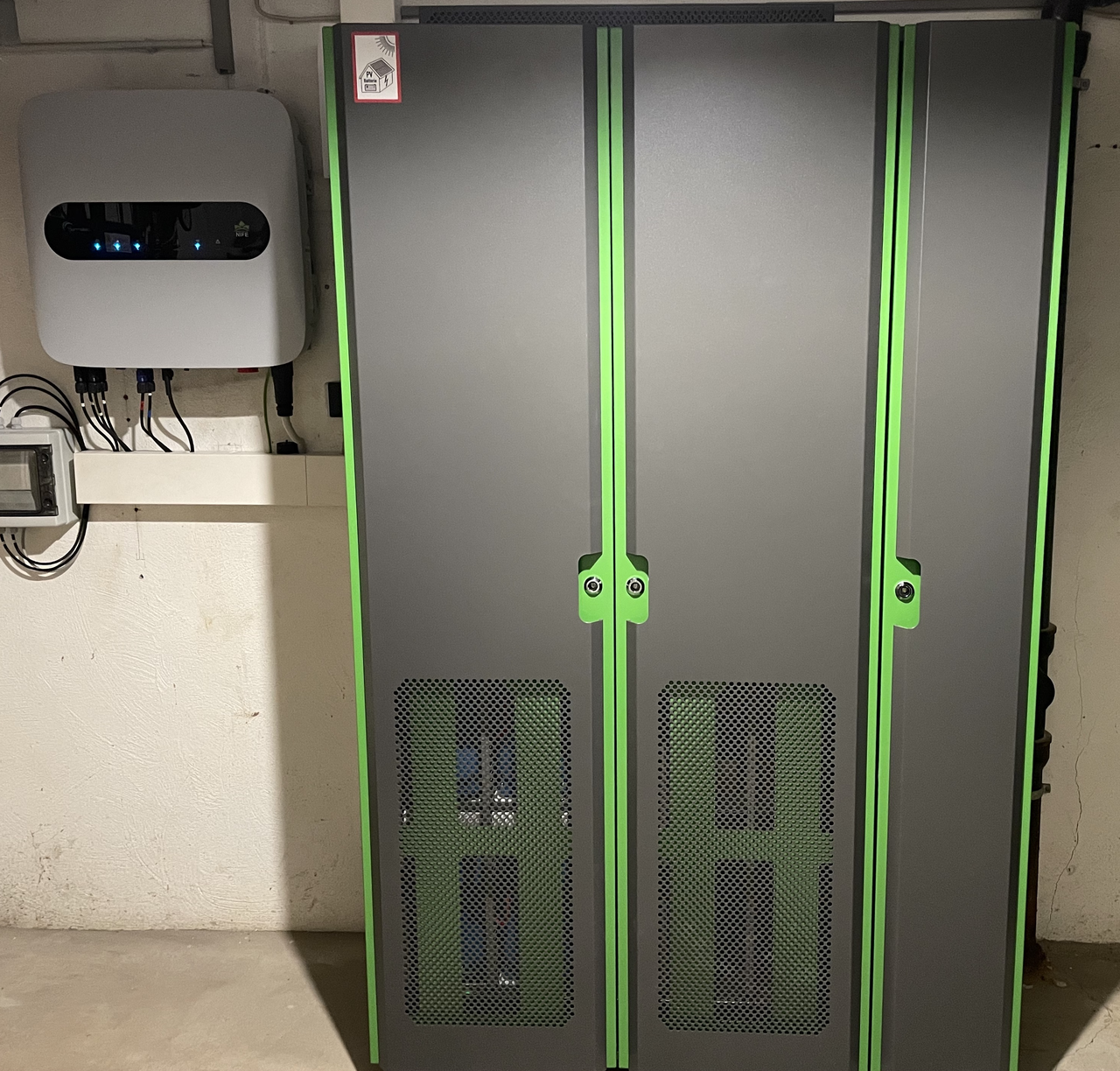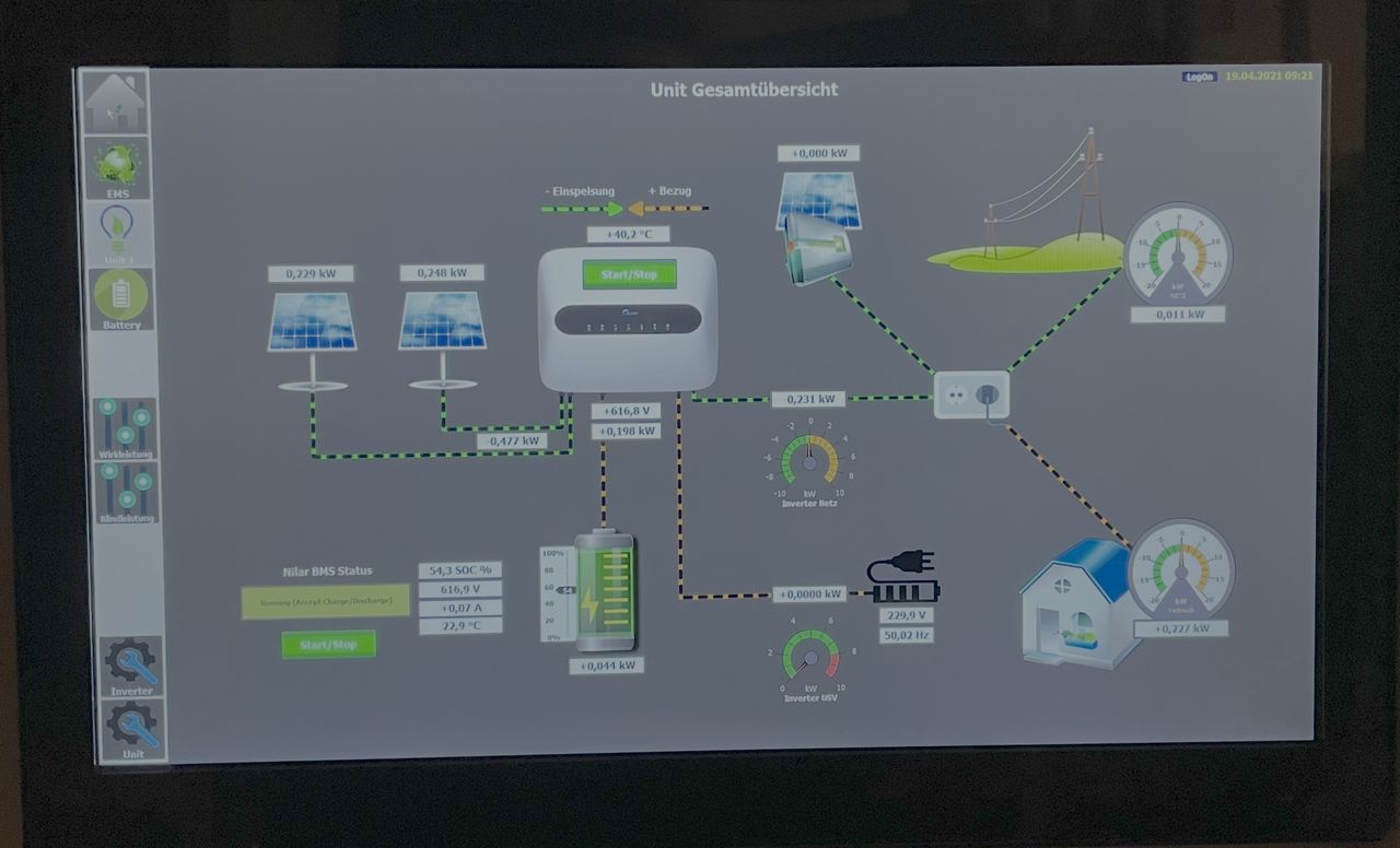 Da Autos meistens dann geladen werden wenn die Sonne nicht scheint wurde ein erweiterbarer Stromspeicher mit momentanen 11,5 kWh verbaut, welcher die eigene Ladestation speisen kann wenn Sonnenleistung zum Laden nicht mehr ausreicht.