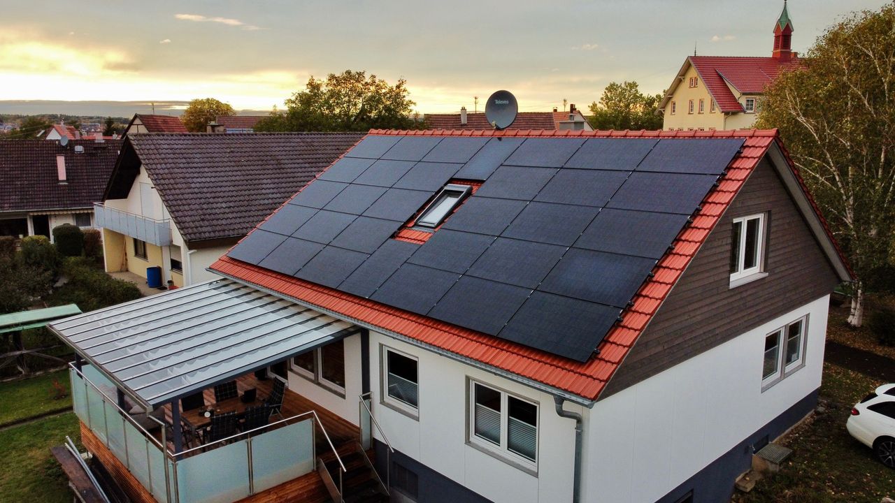 Auf einem Einfamilienhaus wurde zur Senkung der Stromkosten eine Solaranlage installiert.