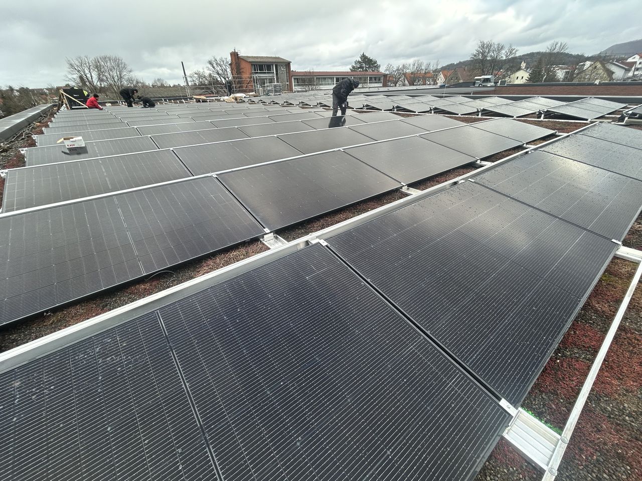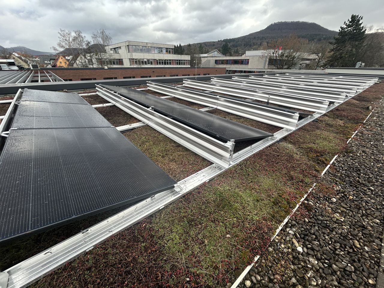 Um die Küche und die Schule mit PV-Strom zu versorgen, wurde auf einem Mössinger Schul- bzw. Kantinengebäude eine große Flachdach PV-Anlage installiert.